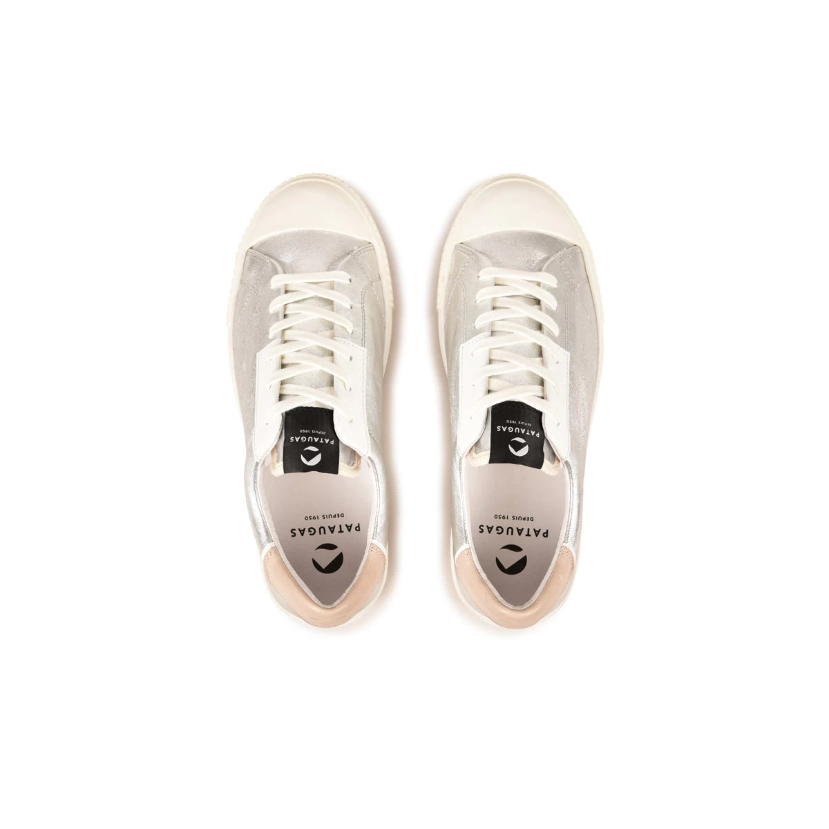 La sneaker femme ARAN est LA nouvelle création de notre marque. Pensée près d’Aix en Provence et conçue au Portugal, cette chaussure est moderne et confortable. Sa semelle est munie de crampons très originaux. C’est une basket vêtue d’un cuir métallisé argenté très shiny et lumineux. Cette basket en cuir s’adaptera à la perfection avec une tenue sobre.