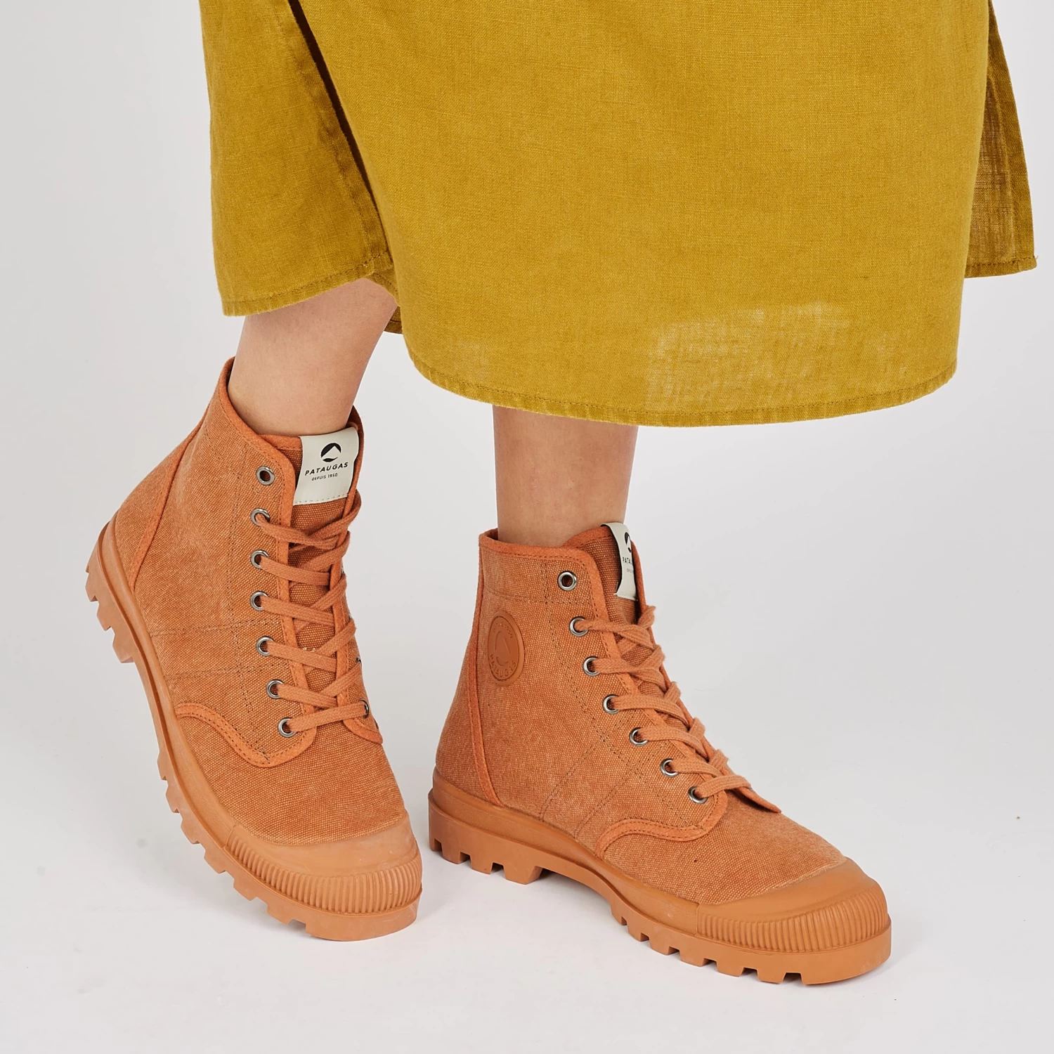 L’iconique brodequin de toile, conçue dans nos ateliers en Espagne, se joue en monochrome cette saison. Accordez vos tenues grâce Ă la boots femme Authentique, munie de sa toile dĂ©lavĂ©e couleur brique inspirĂ©e par la technique du garment dye. Sa semelle en caoutchouc naturel monochorme lui confère un grand confort et maintien.