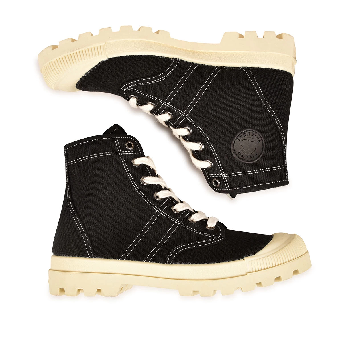 Optez cette saison pour la version de la boots femme Authentique revisitée avec une toile recyclée robuste et légère. Cette boots est vulcanisée dans une semelle en caoutchouc naturel ce qui la rend plus souple et plus responsable. Ses surpiqûres blanches rehaussent sa toile noire pour un rendu vintage et moderne.