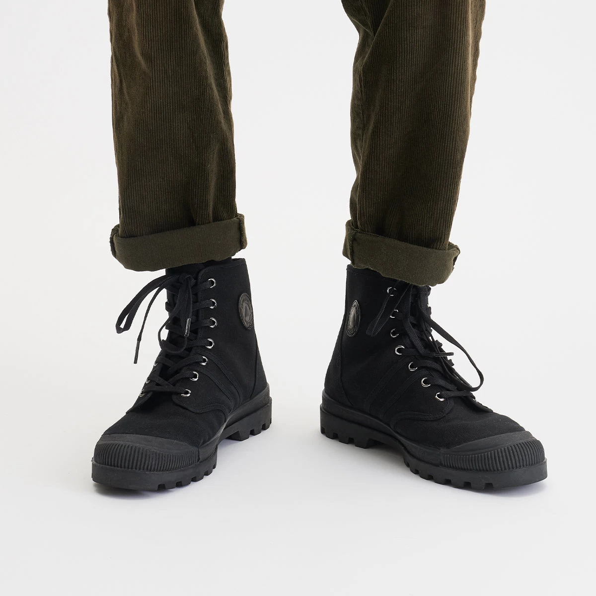 La boots homme Authentique est revisitée depuis le brodequin original avec une version plus éco-responsable. Conçue avec une toile noir en coton recyclé, cette chaussure montante en toile est montée sur une semelle ultra-souple en caoutchouc naturel. Sa semelle en caoutchouc naturel lui garantit une grande souplesse afin de vous accompagner dans tous vos mouvements quotidiens. Son logo est placé à l’intérieur pour protéger la malléole.